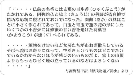 また、高価な薫物を煙いほどにたなびかせている様を見た源氏の君は、室内に焚きしめる空薫きは、どこで焚かれているのだろうかと思うほどに控えめなのが良いのですよ。富士のお山よりも煙がたなびいては、風情がありません。と女房たちをいさめるのでした。
