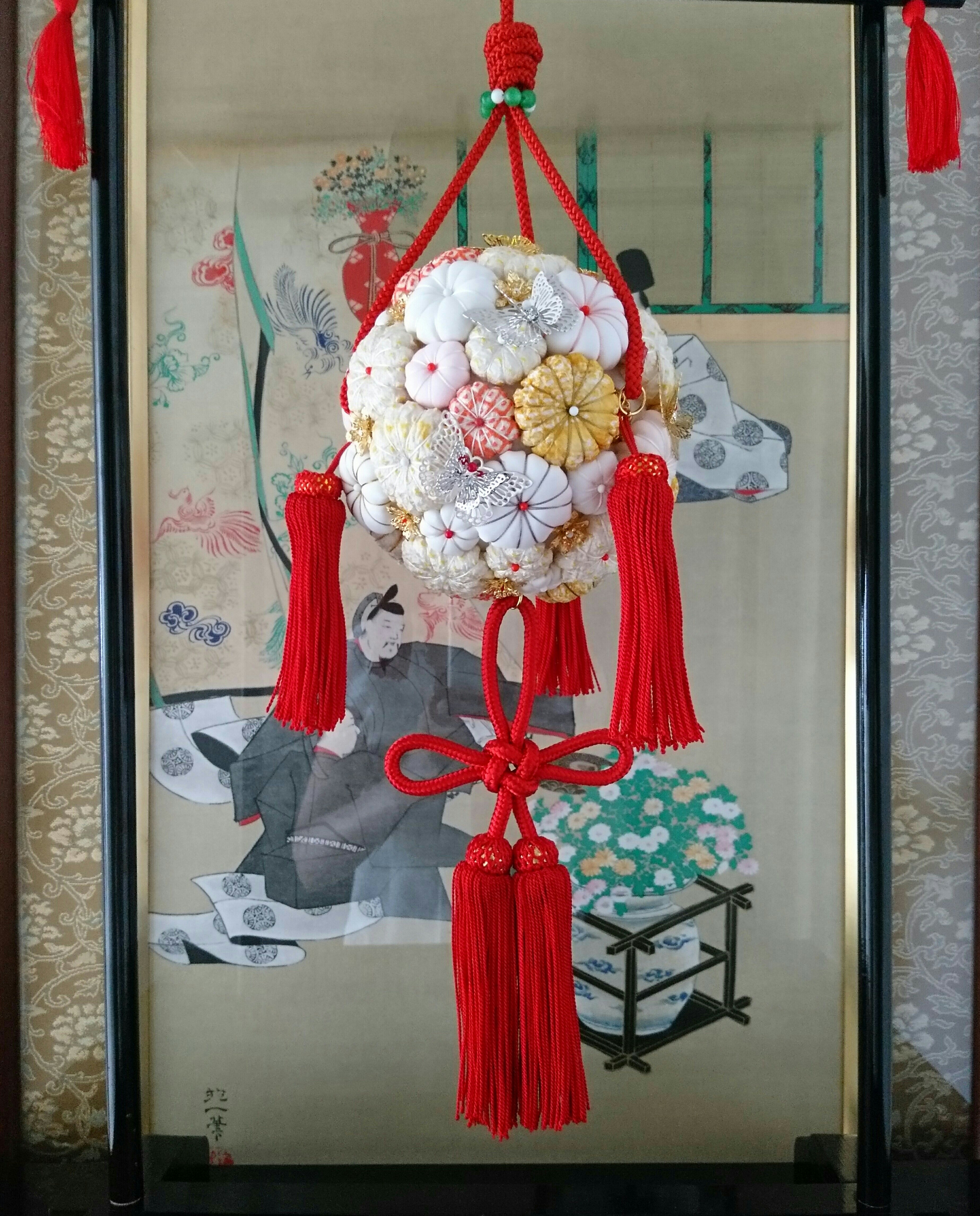 菊の薬玉の制作も順調に進み、完成間近です。黒塗りの衣桁も仕立て上がりました。